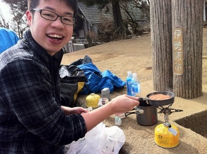 ランチのあとは山頂にある「阿夫利神社」にお参り。おのおの「山行を無事に・・・」とか「下りでヒザが痛みませんように・・・」などとお祈りするつもりでしたが、「筆者」君から皆に「お賽銭を10円ずつ渡すので自分の試験合格祈願を~」と懇願されたため、いたし方なくお賽銭を50円に増額し、ついでに合格祈願。