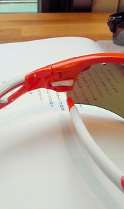 まず、左のテンプル付け根の内側にレバーがございますので、レバーを引きながら折りただんで頂きますと・・・