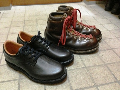 防水ワックスを塗ったあと亀の子タワシでガンガンこすリまくる山靴と違い、缶入り靴墨でツヤを出すだけなのでお手入れ簡単。