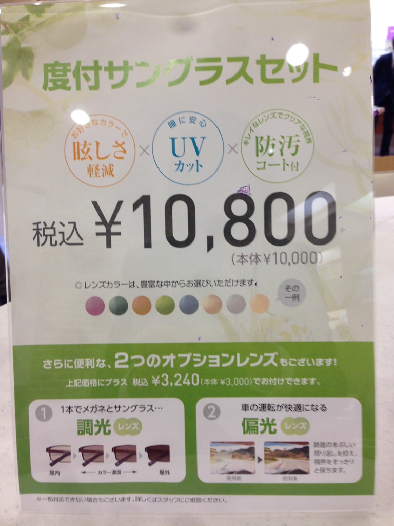 今なら度付サングラスが¥10800で出来ちゃいます(※付属レンズは単焦点。レンズの種類はスタッフにご確認ください)。