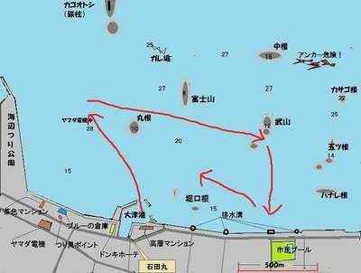最初にヤマダ電気沖 ⇒ 武山 ⇒ プール前(第3排水溝) ⇒ ヤケクソのわけ分からない知らないとこ