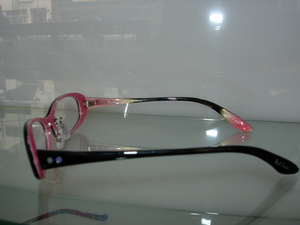 左テンプル外側にはポールスミスカラーのシルバーとパープルの丸プレートを埋め込み、右テンプル内側にPaul Smithの直筆メッセージ「Make Love not war」を入れたニューカテゴリー。クリングス付きプラスティックフレーム。