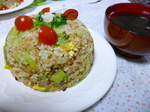 カニレタスチャーハン+もずくとわかめの中華スープ(付属のアイツ)です。