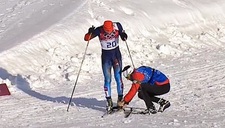 ロシア代表選手がレース中に転倒し、スキー板が折れてしまうというアクシデントがあった。