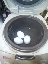 ①まず冷蔵庫から取り出した卵3ケを炊飯器に入れそこヘ沸騰したお湯を卵がかぶる位に入れます。