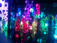 鏡張りの部屋に色が変化していく物体があり、空間が何倍にも広がって開放感があり
