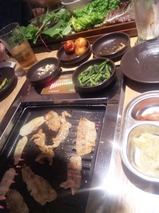 新鮮な有機野菜(聞いた事のない野菜が20~30種類)に、お肉・ネギ・コチュジャンなどを巻いて食べます。チゲが一緒に付いてくるのですが~ これがまたウマイ!! ご飯も普通の白米とムギご飯がえらべて嬉しいです。 あ~お腹いっぱい・・・ なのに(^д^;)