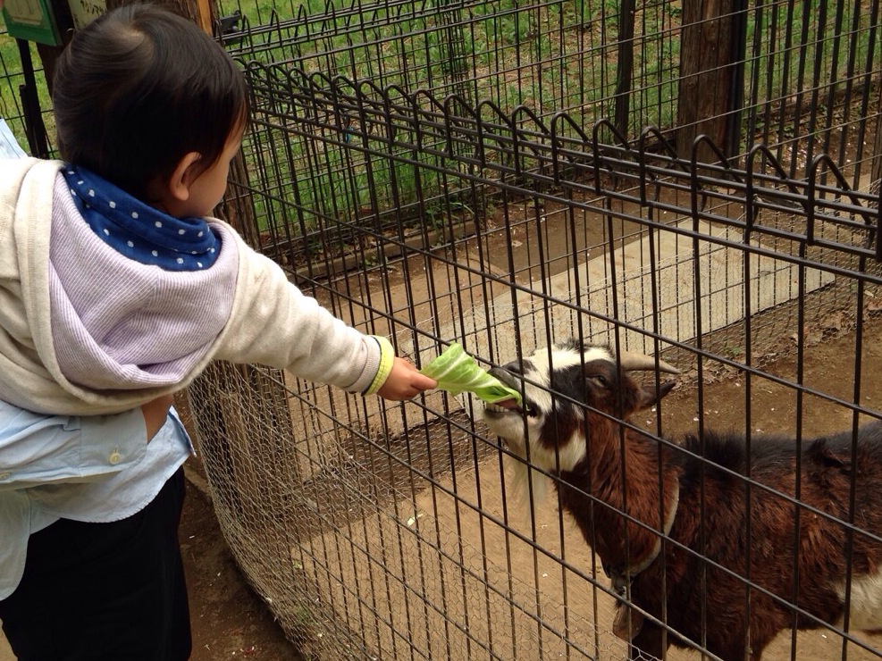 ミニ動物園でヤギのえさやりにハマったり。