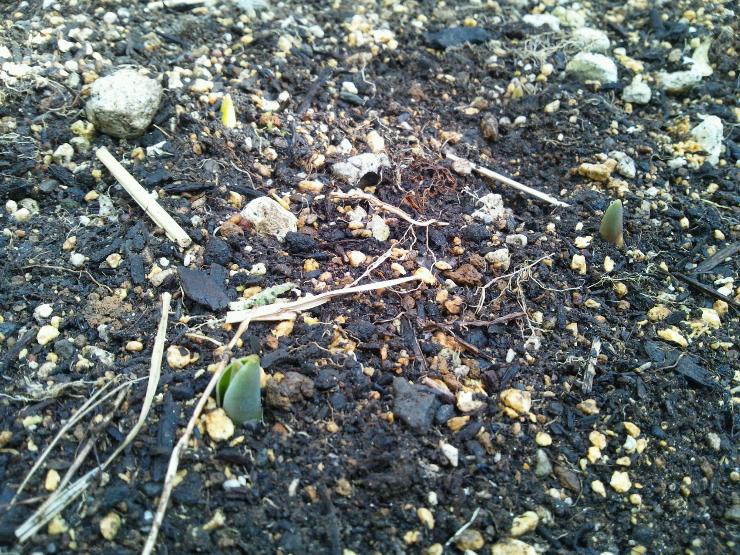 去年の秋に植えたチューリップの新芽が土の中から頭を出し始めました!!