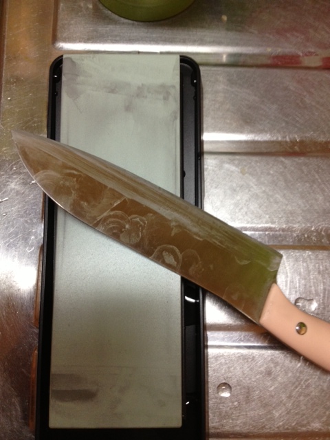 こんな風に研ぎ汁が出てきますが、これが包丁研ぐのには必要らしく、捨てずに続行です。