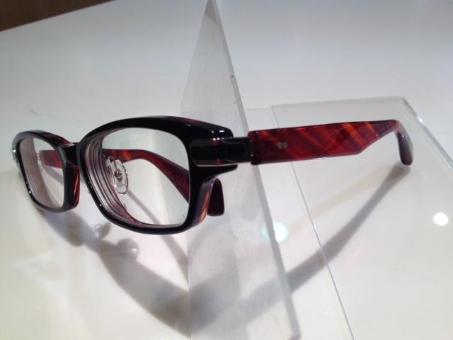 セルロイドの生地で作られたこのフレーム。テンプルの赤がイイ味出してます。