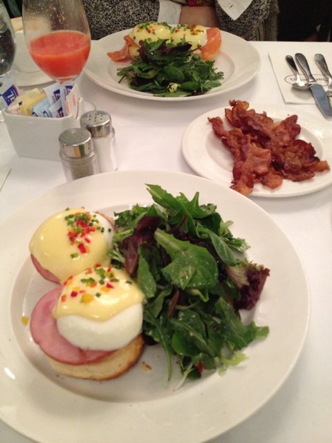 エッグベネディクトです。マフィンの上にベーコンとポーチドエッグが乗っています。
