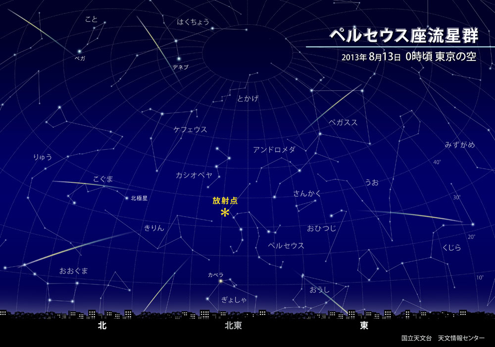 今年は条件も良く月明かりも邪魔をしないそうで、極大(活動が一番活発になる)は13日の午前3時頃との事。放射点(ここを中心にして飛んでくる)は北東方向なんですが、光る場所は北東とは限りません。たくさん見るコツは、夜空を見上げたときに視界に街灯などが入らない方向をぼんやり眺めていると、意外とたくさんの流星が観察できます。