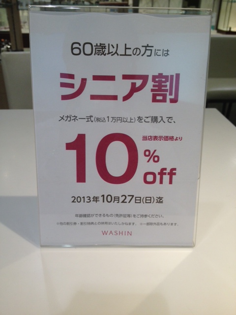 10/11~10/27の期間中、メガネ一式10000円以上ご購入の60歳以上のお客様のみ