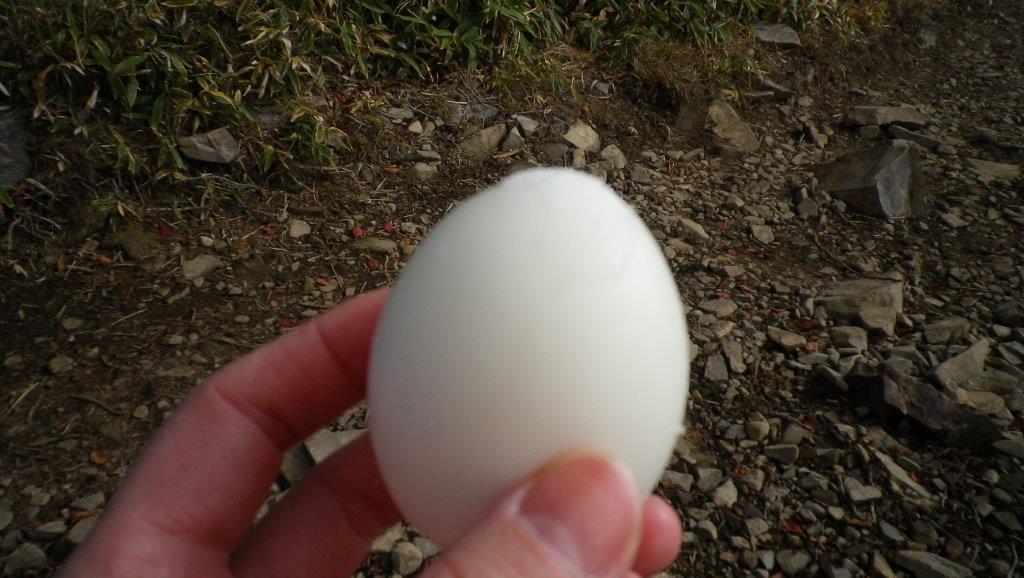とりえず、岩陰で「ゆで卵」休憩。雲が晴れるのを待つことに(寒さで写真ピンボケ)。