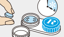 レンズケースに新しい用剤を満たし、レンズを完全に浸します。レンズケースのキャップをしっかりと締め、4時間以上放置します。