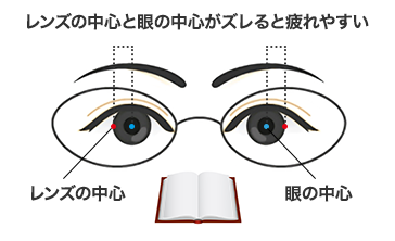 オーダーメイドの読書用メガネの作製時には、瞳孔の中心とレンズの中心位置を考慮してお作りしますが、既製老眼鏡の場合、安価に販売する為に画一的な仕様で大量生産する都合から、その位置関係を個別に設定することが出来ません。このズレも眼精疲労などに影響する要因と言われています。