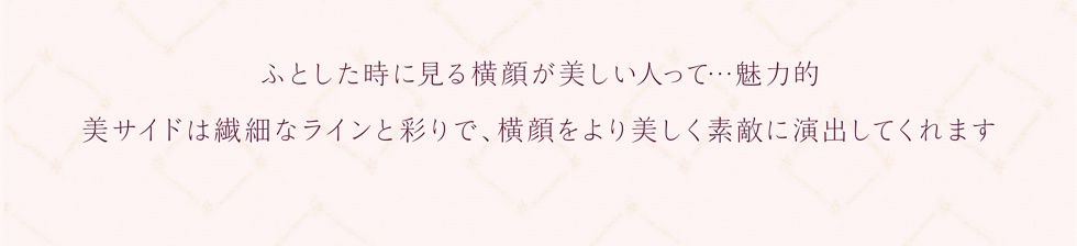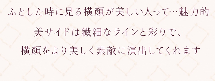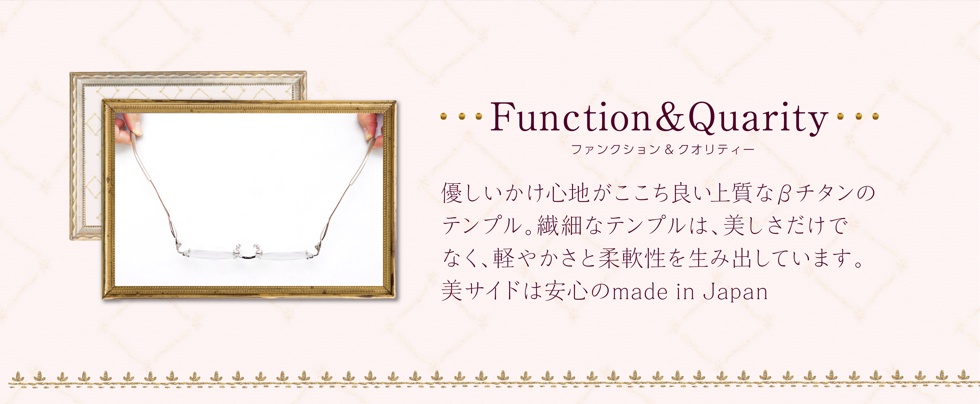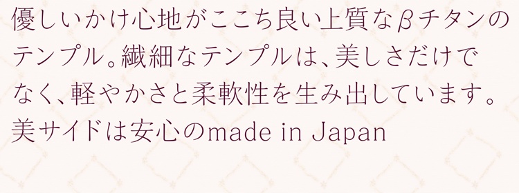 2枚のβチタンテンプルが立体的に交差したデザインが印象的で、横顔をエレガンスに演出します。フロントは縁なしなのでサイドのデザイン一層が引き立ちます。また、適度なバネ性があり、しなやかな掛け心地です。レンズ付 23,100円(税込)