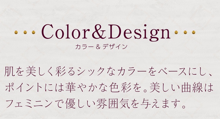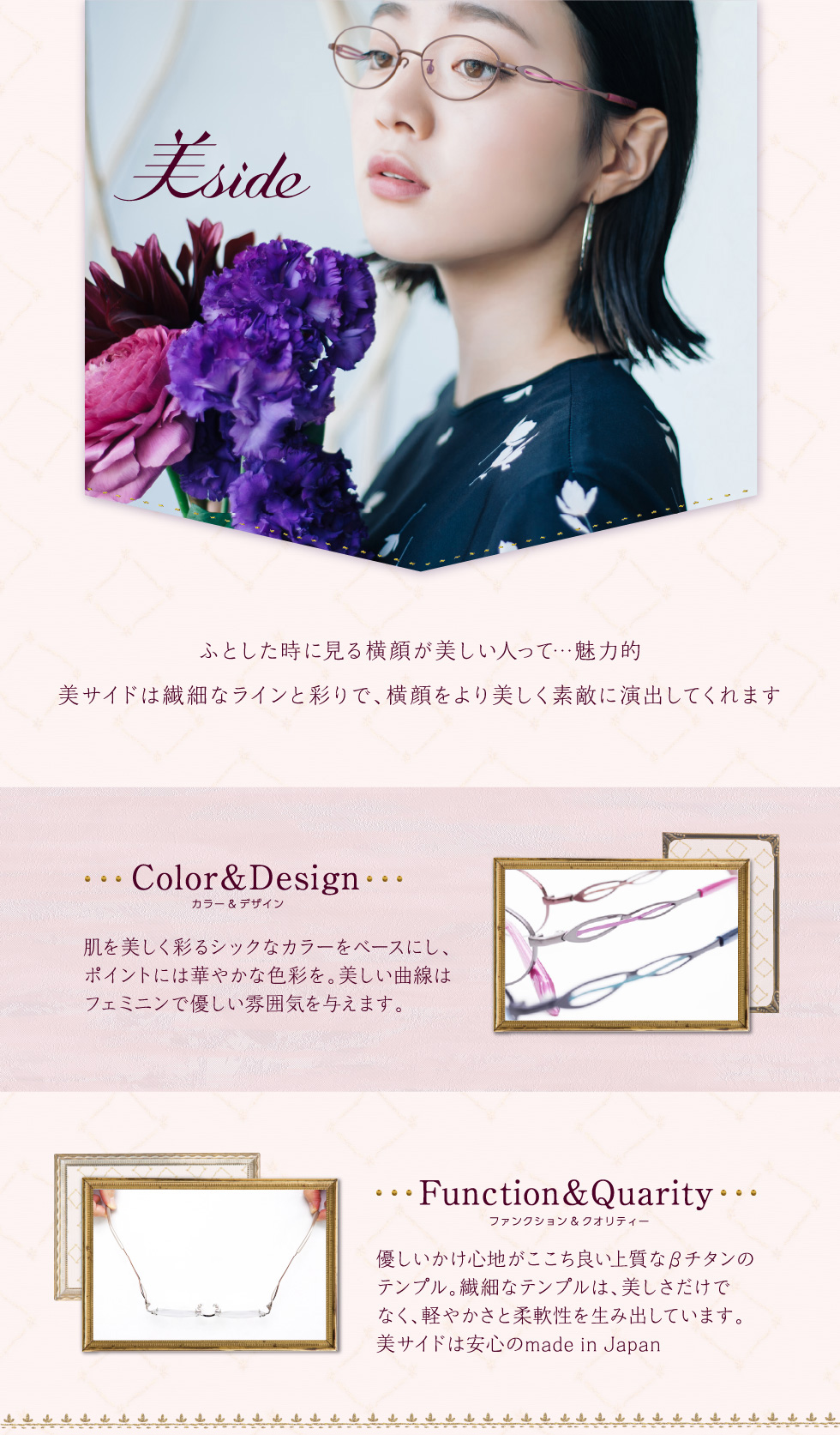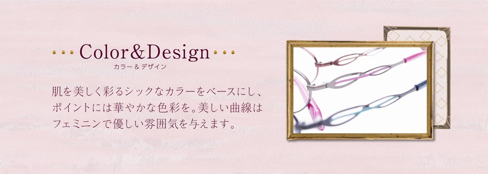 サイドの楕円形のモチーフ部にアクセントカラーをのせたデザインが横顔を華やかに彩ります。テンプルの美しい曲線はデザイン性だけでなく適度なバネ性の掛け心地を生み出しています。