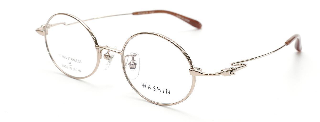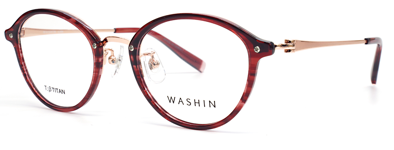 WASHIN Tシリーズ第3弾はユニセックスのクラシカルモデル。玉型はクラウンパウント、テンプルに彫り細工模様を施し、ヨロイは割智を採用。1カラー、3カラーはフロント転写となります。レンズ付 23,100円(税込)