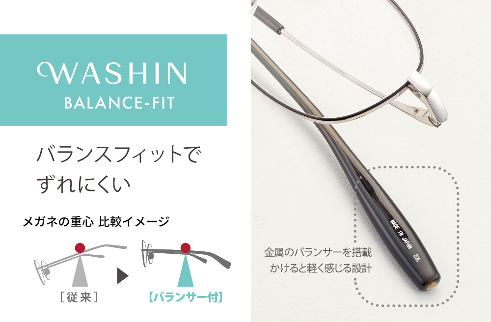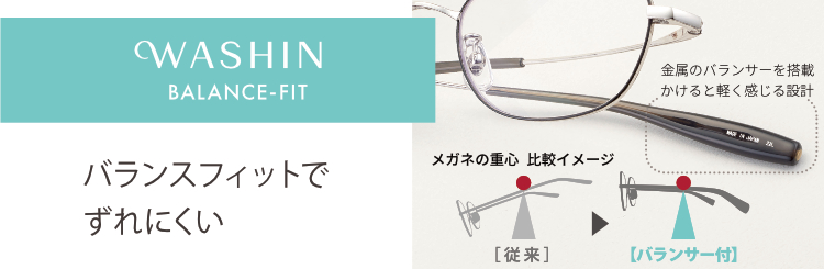 モダン内部に金属の重りを内蔵し、重心を耳側に寄せることでメガネのズレ落ちを防ぐバランサー機能を備えており、お鼻への負担を軽減したバランスの良い掛け心地が実現しました。程良いスクエア感のある玉型により、すっきりとしたお顔の印象を演出するデザインとなっております。レンズ付 25,300円(税込)