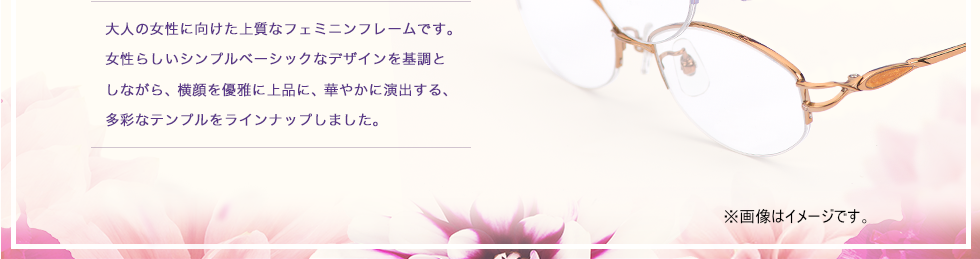 βチタンの抜きテンプルが華やかで愛らしいデザイン。軽くしなやかで掛け心地もいいフレームです。レンズ付 15,400円(税込)完売しました