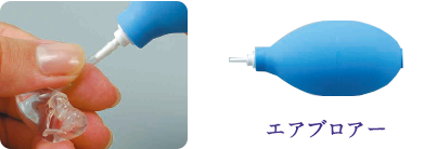 イヤモールドは、補聴器から外して水洗いし水気をふき取ります。内部に残った水滴は、エアブロアーで吹き飛ばします。
