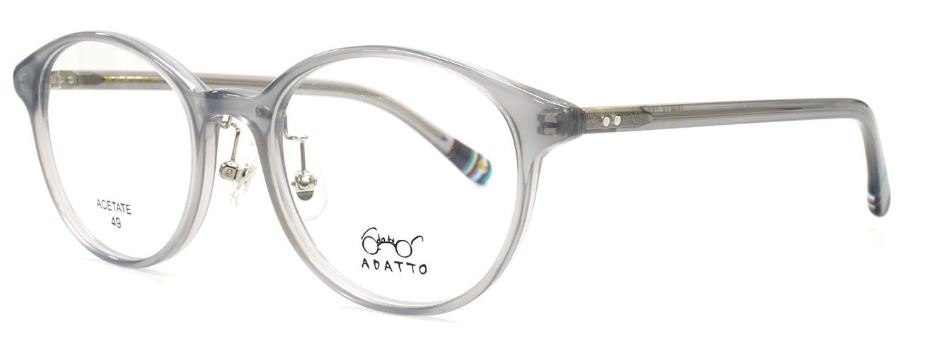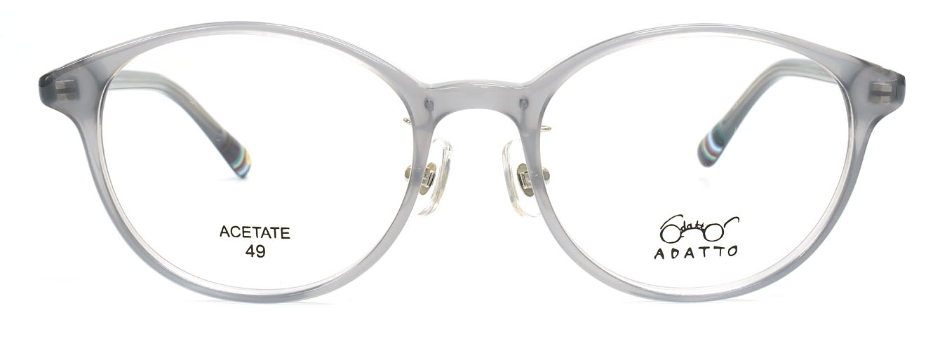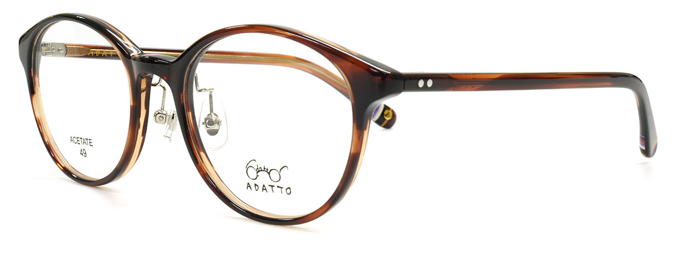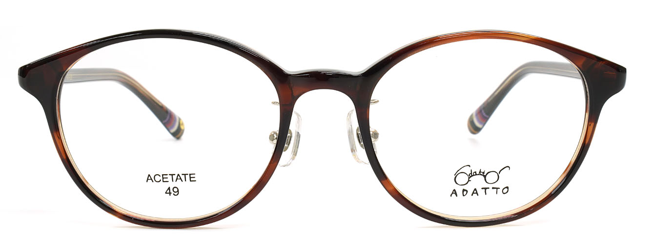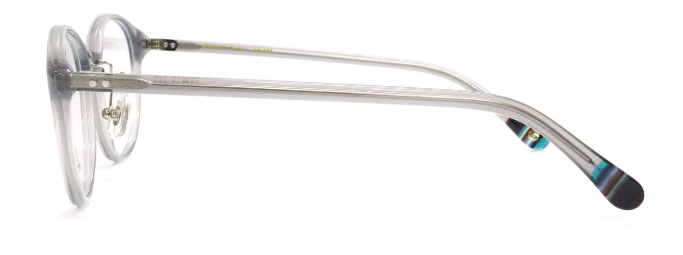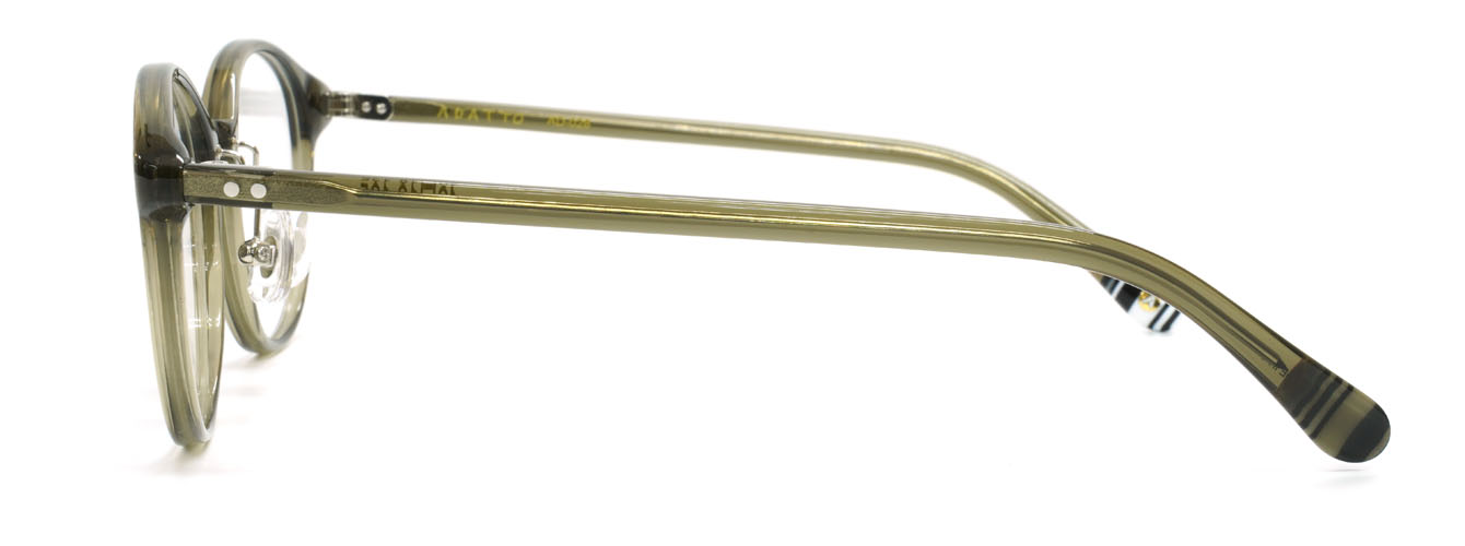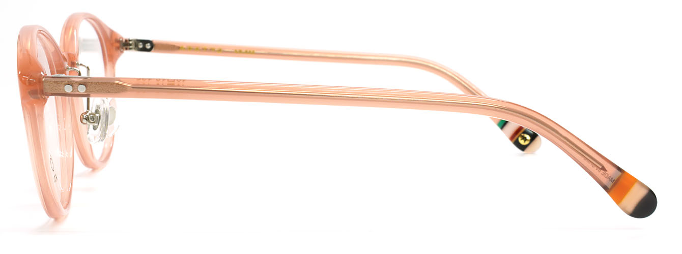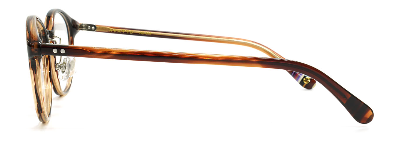 リムラインを細く仕上げたすっきりとしたセルフレーム。丁番パーツはカシメ手法にて取り付けられた手の込んだ作りです。テンプルの先のストライプ生地がワンポイントになっています。