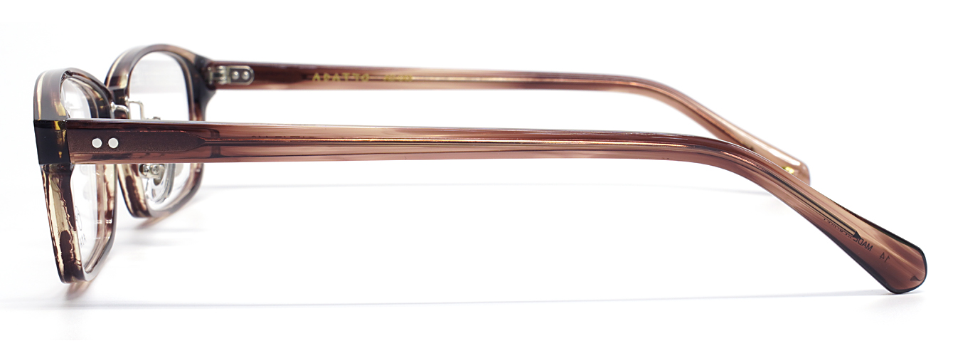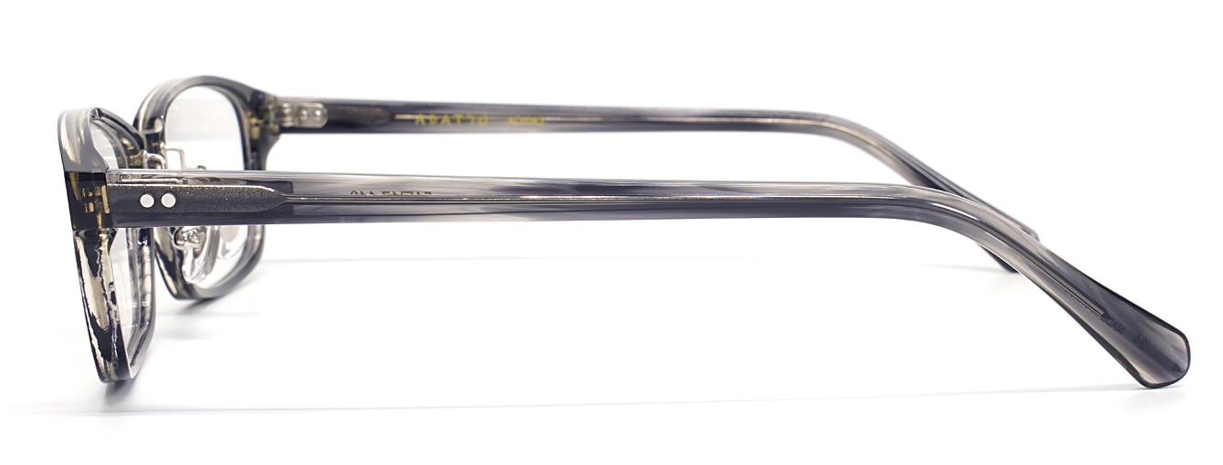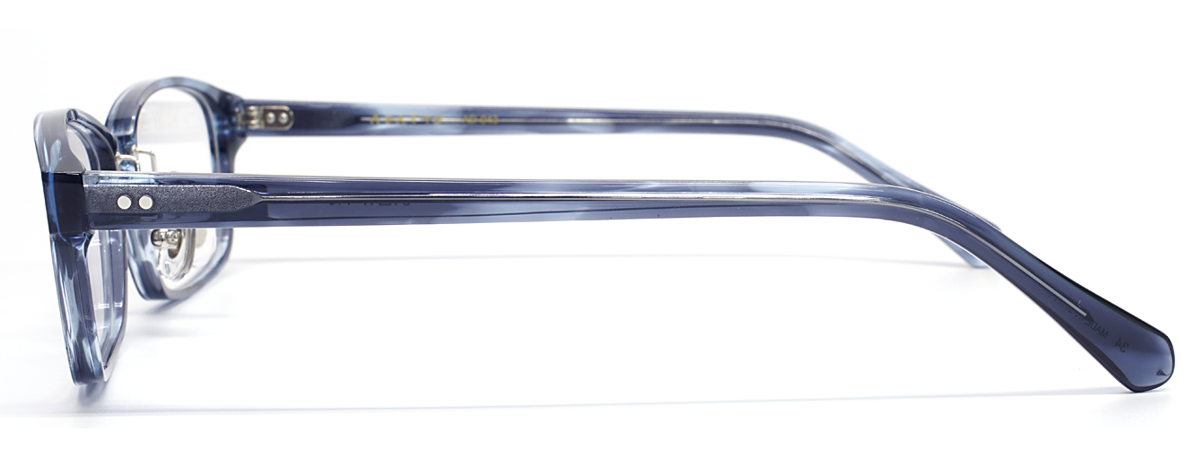 リムラインを細く仕上げたすっきりとしたセルフレーム。丁番パーツはカシメ手法にて取り付けられた手の込んだ作りです。エッジを効かせた仕上げがよりシャープな印象をもたらします。