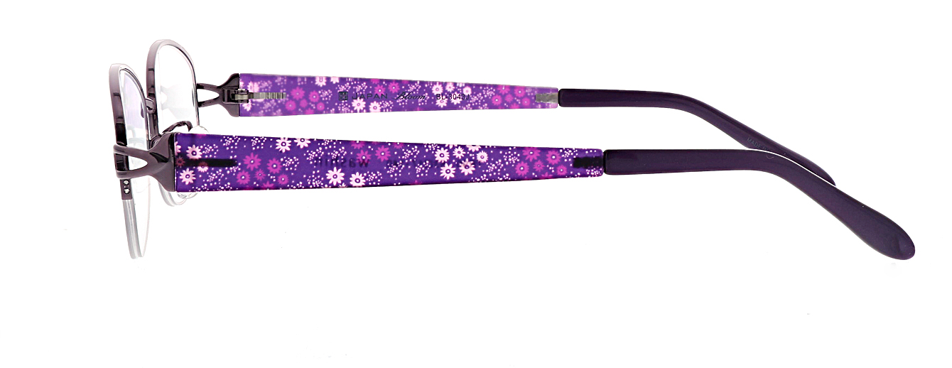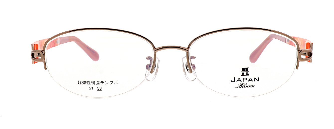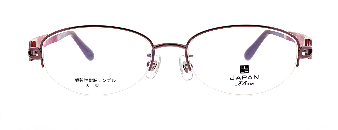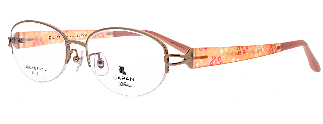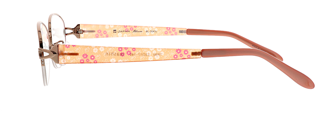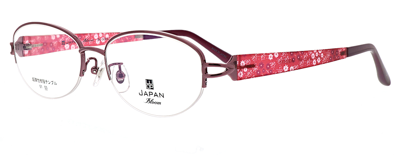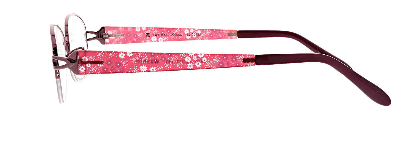 超弾性樹脂TR91を使用したテンプルに、フラワー柄をプリントした華やかなフレーム。耳にかかる部分は調整ができる作りなので、しっかりとフィッティングが可能です。