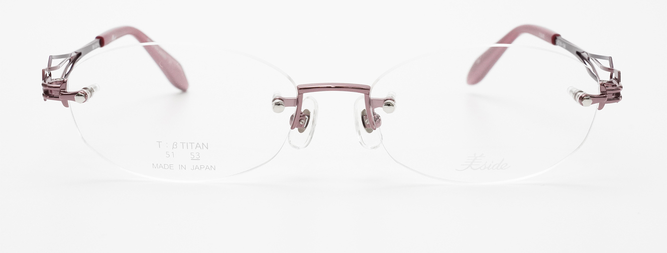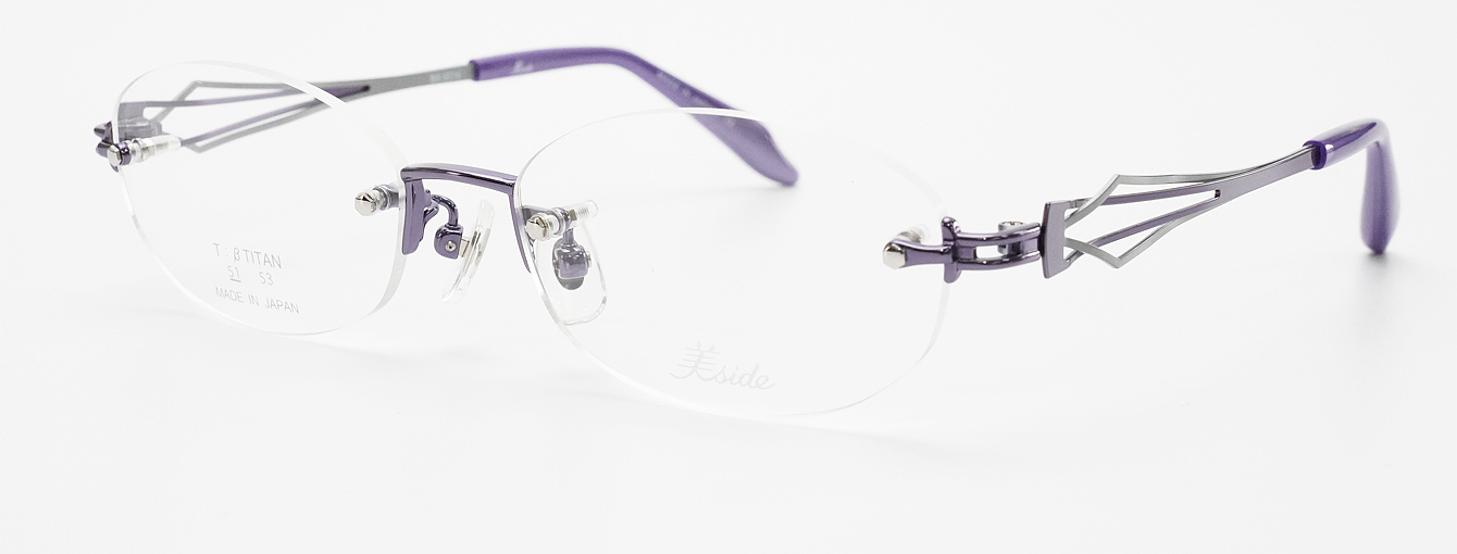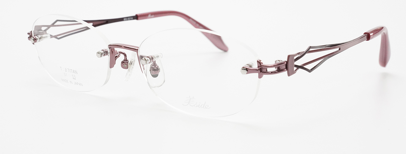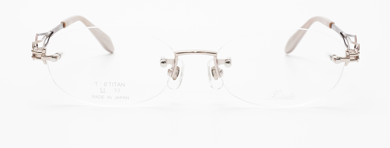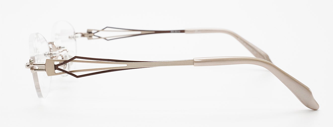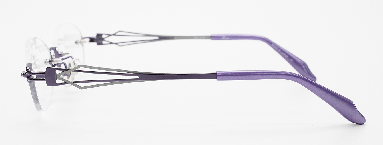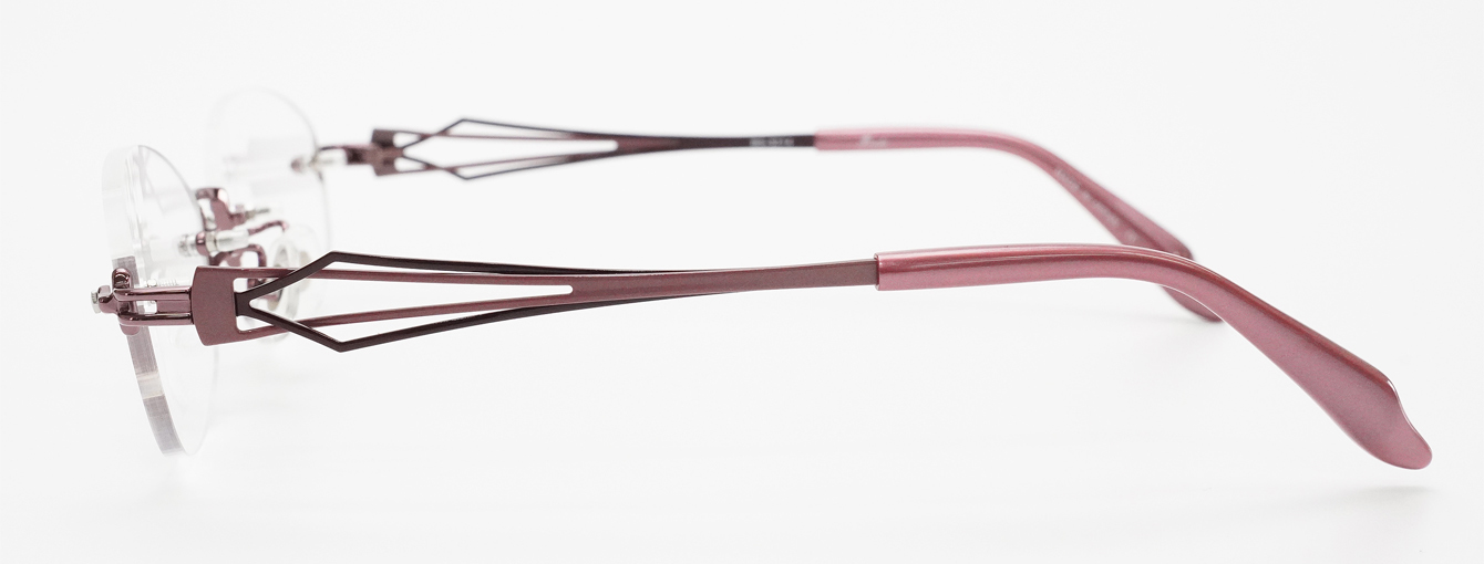 2枚のβチタンテンプルが立体的に交差したデザインが印象的で、横顔をエレガンスに演出します。フロントは縁なしなのでサイドのデザイン一層が引き立ちます。また、適度なバネ性があり、しなやかな掛け心地です。
