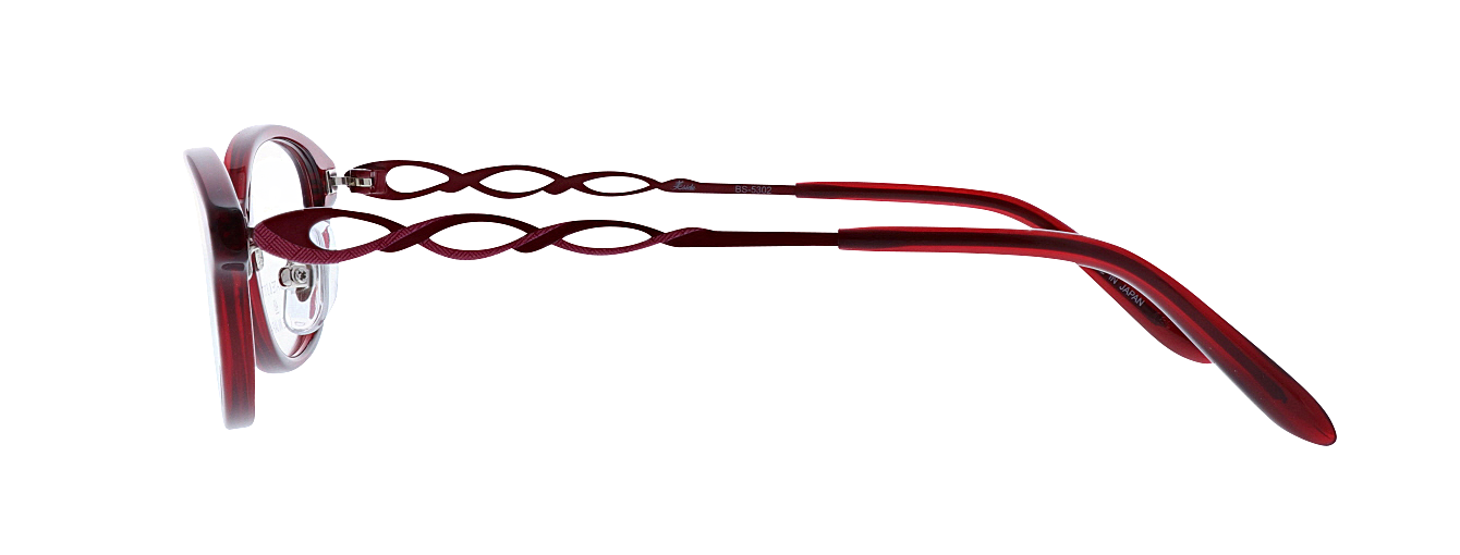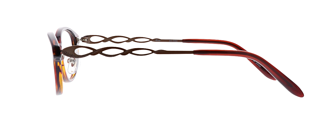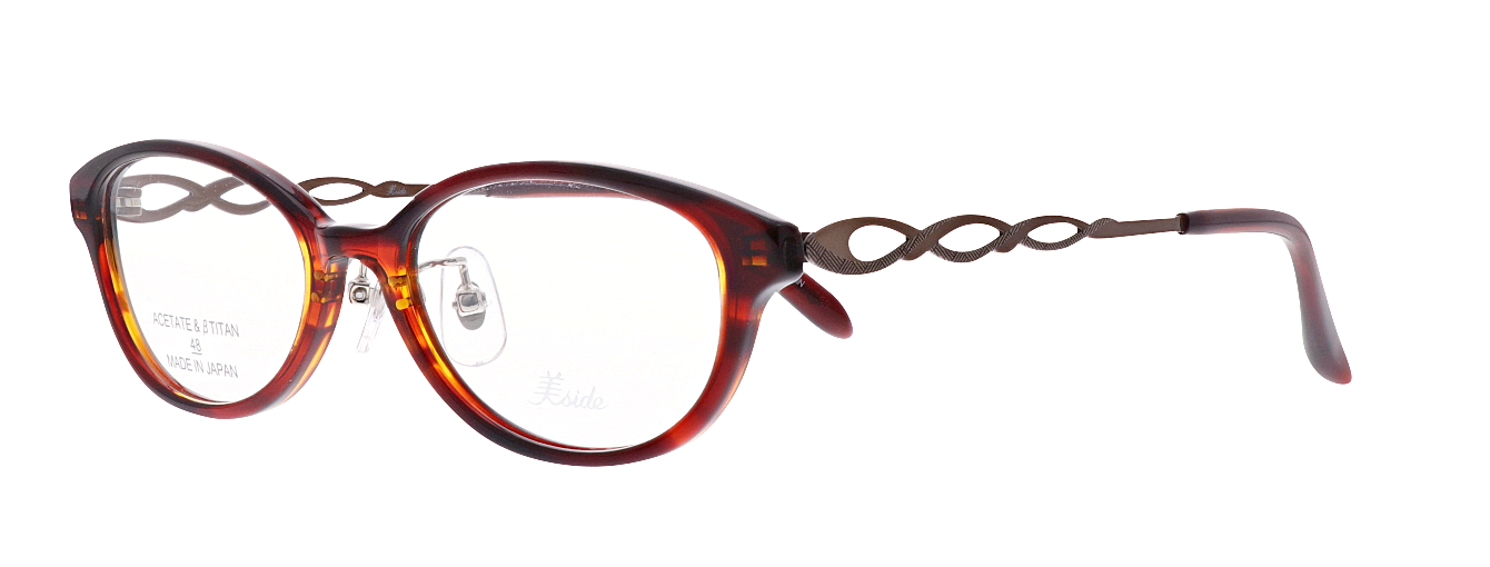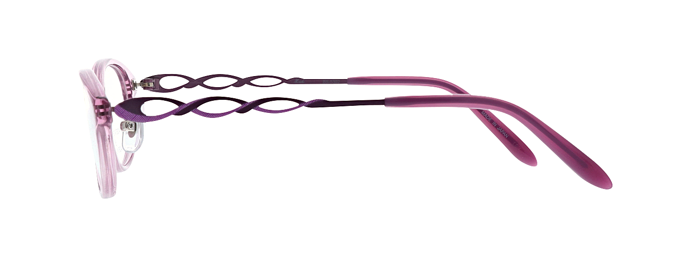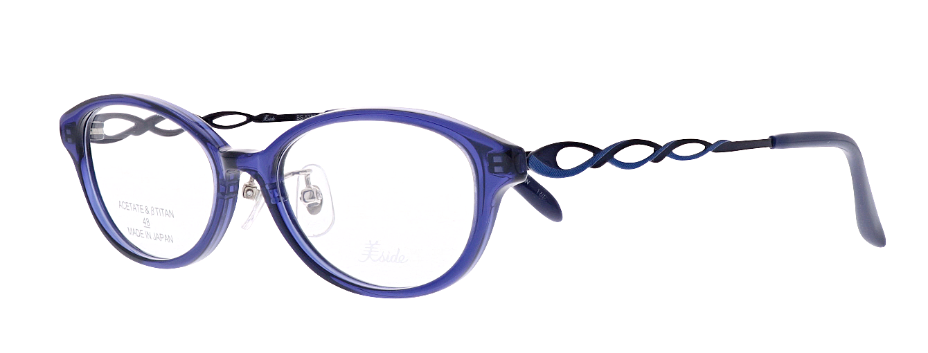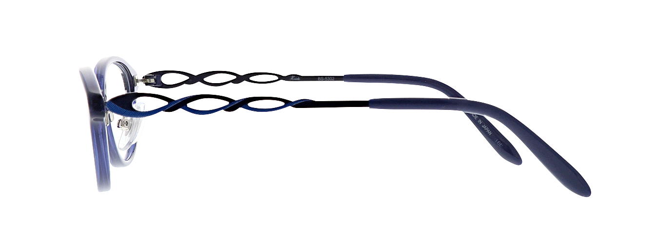 美サイドの新シリーズは、フロントがアセテート、テンプルβチタンのコンビネーションフレーム。フロントはクリングス付で調整が可能。テンプルはβチタンに抜き加工を施した上に、印刷で彩をプラスしラインが交差しているようなデザインになっています。