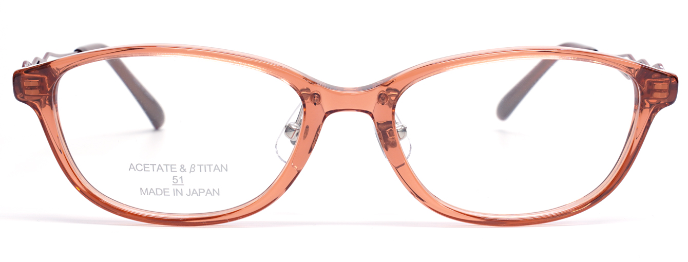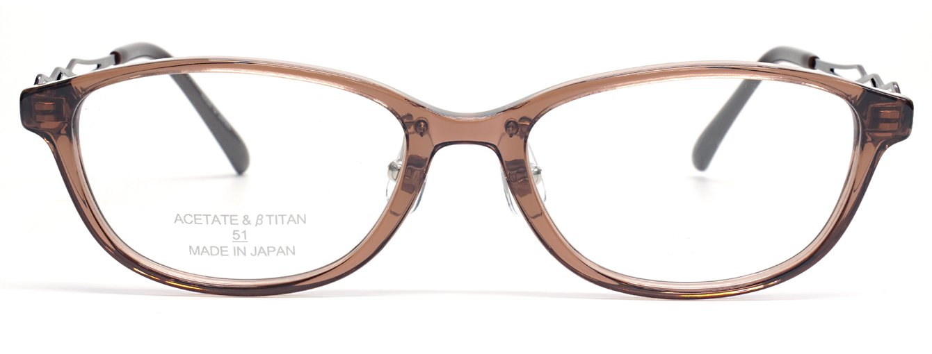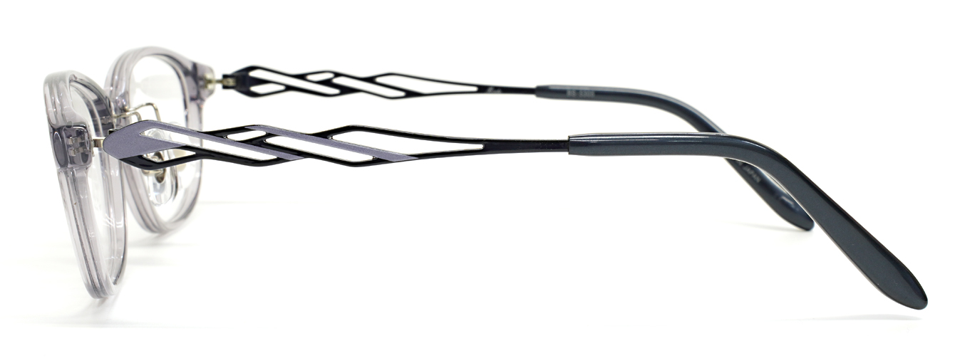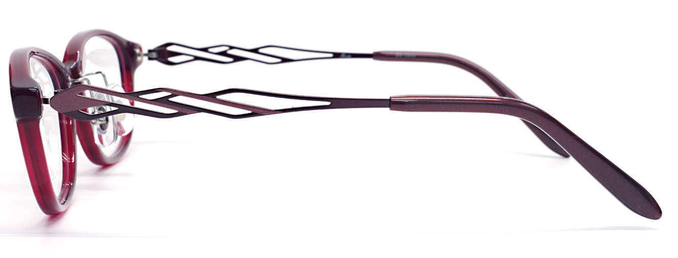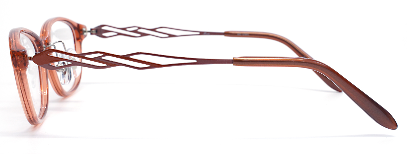 きれいな彩りのプラスチックフロントと、βチタンテンプルのコンビネーションフレーム。フロントはリムを細く仕上げているのですっきりとした印象。クリングス付で調整が可能。テンプルはβチタンに抜き加工を施した上に、印刷で彩をプラスしたデザインになっています。