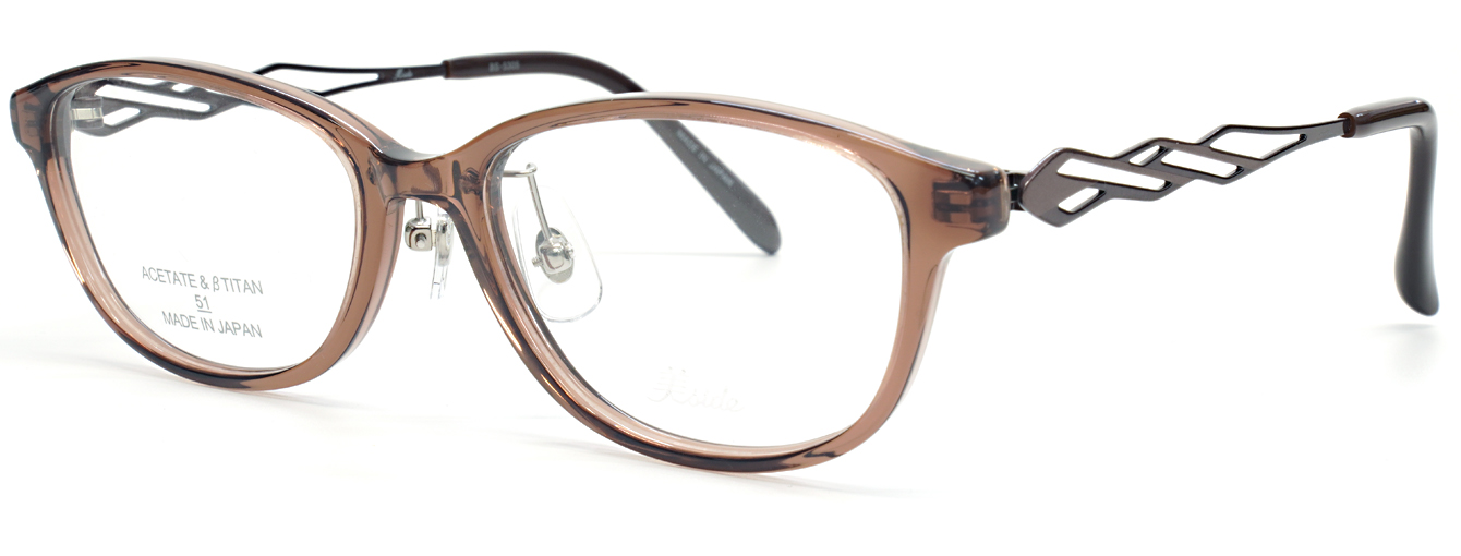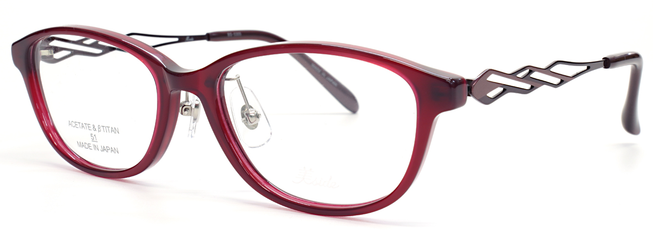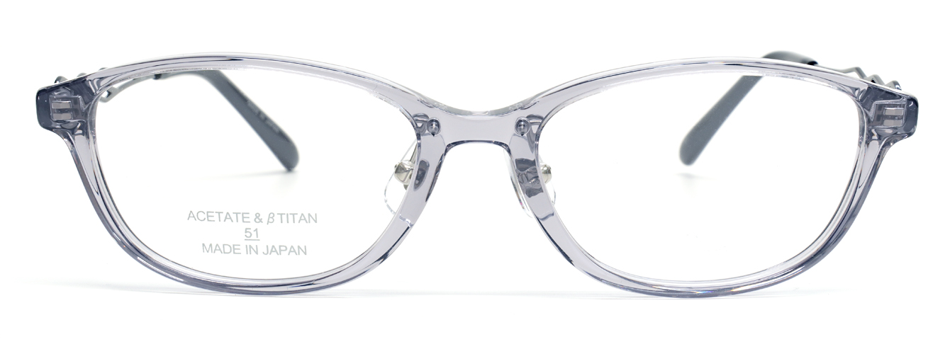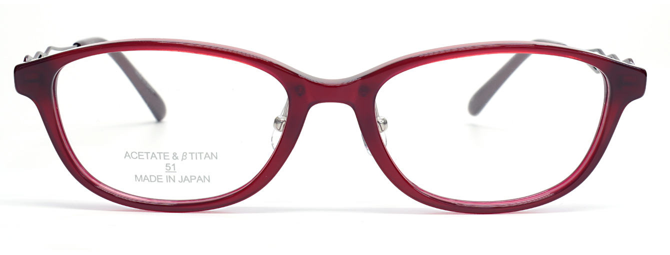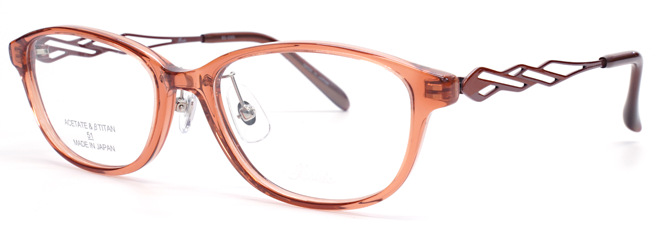 きれいな彩りのプラスチックフロントと、βチタンテンプルのコンビネーションフレーム。フロントはリムを細く仕上げているのですっきりとした印象。クリングス付で調整が可能。テンプルはβチタンに抜き加工を施した上に、印刷で彩をプラスしたデザインになっています。