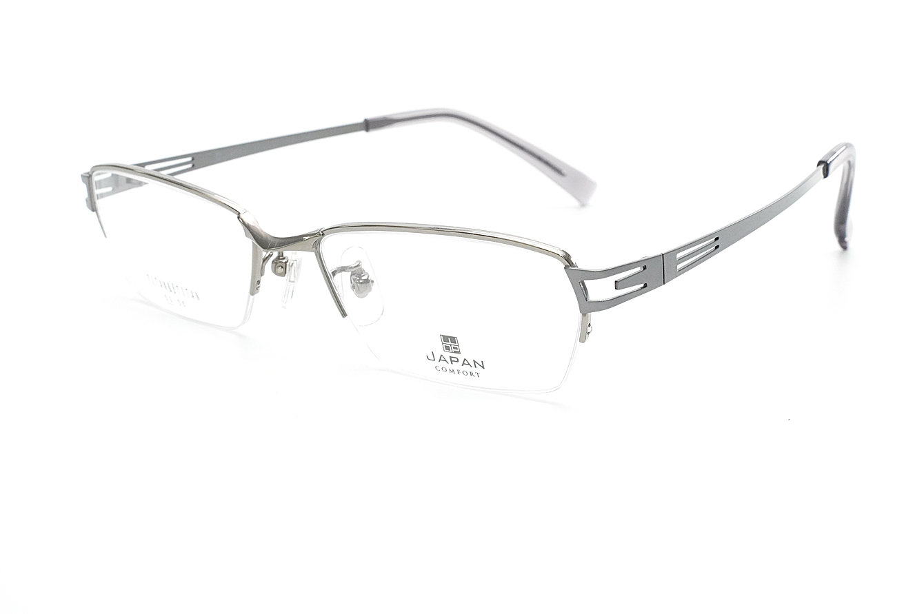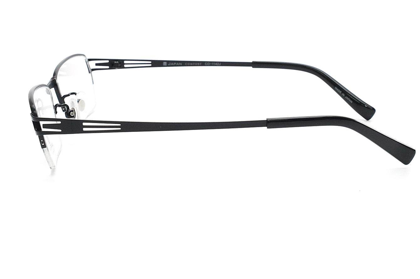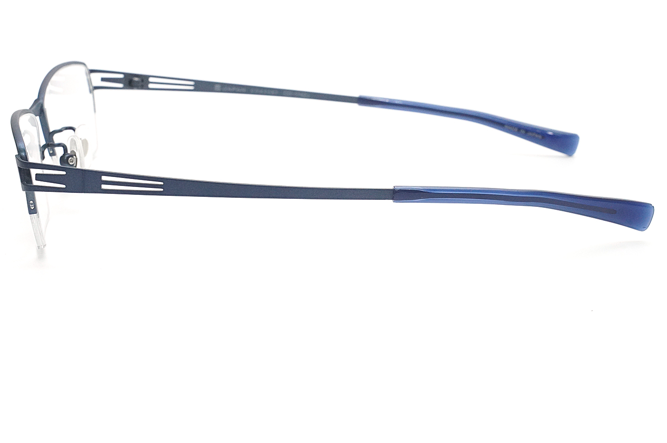シャープな抜きデザインのテンプルが特徴のメンズ向けスタイリッシュなフレームです。βチタンのシート材を使用したバネ性のあるヨロイ・テンプルです。