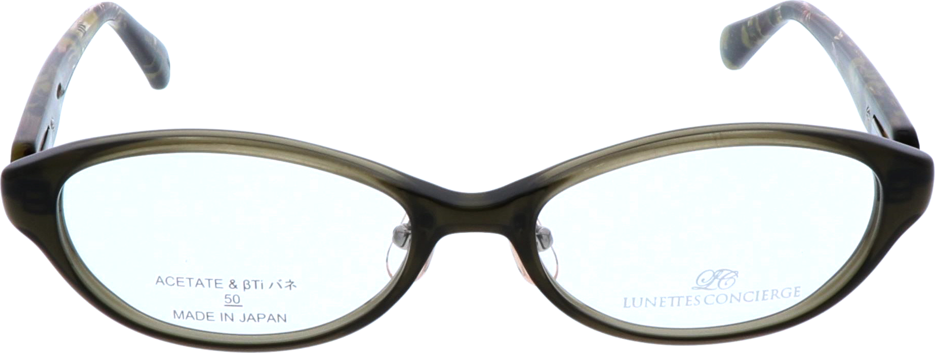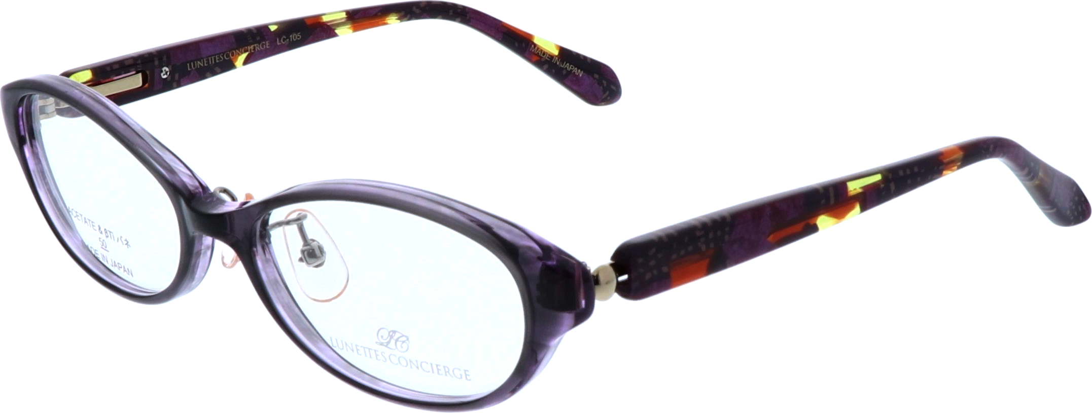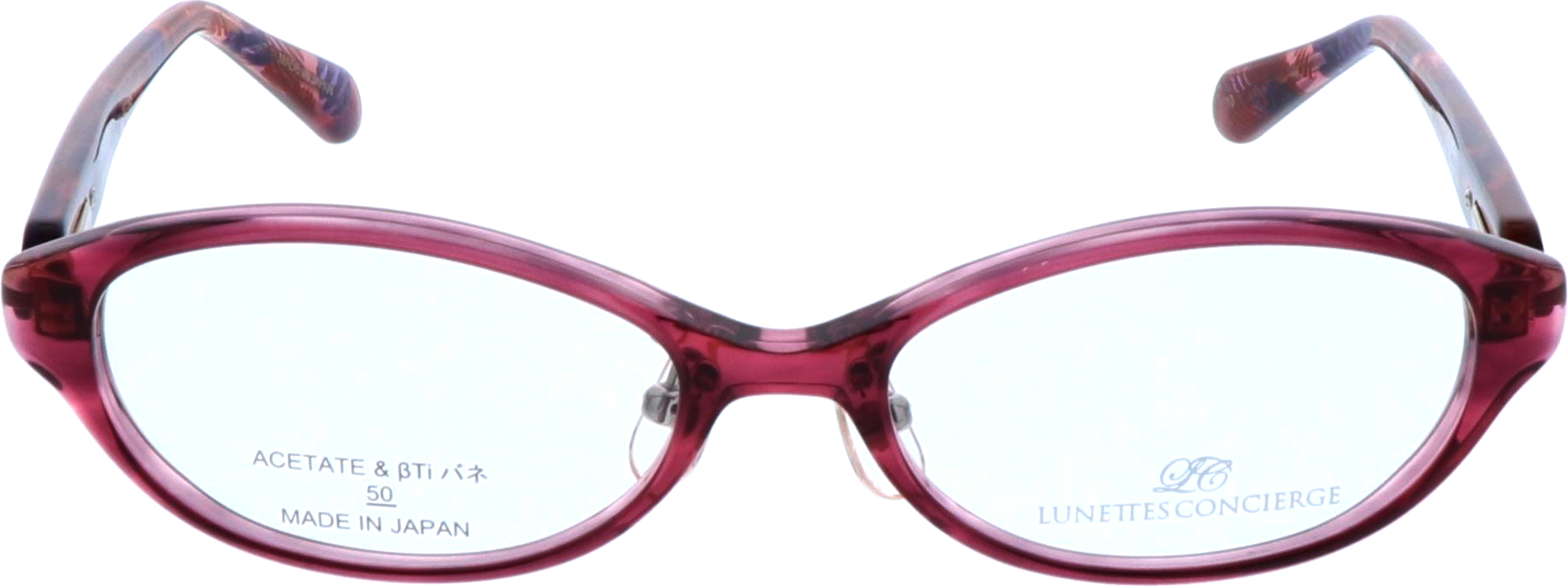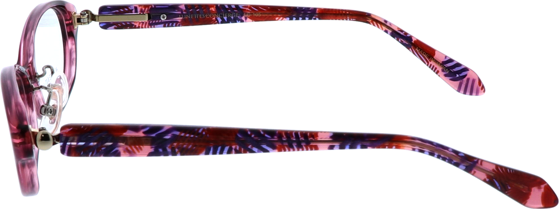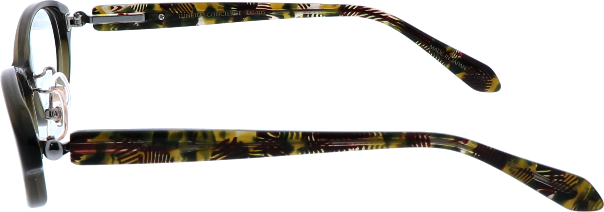 単色系の透明感あるフロントと、華やかな色味の個性的な柄生地のテンプルの組み合わせがお洒落デザイン。 ナチュラルでフェミニンなレンズシェイプは、アンダーリムが上昇ラインでリフトアップ効果もあります。