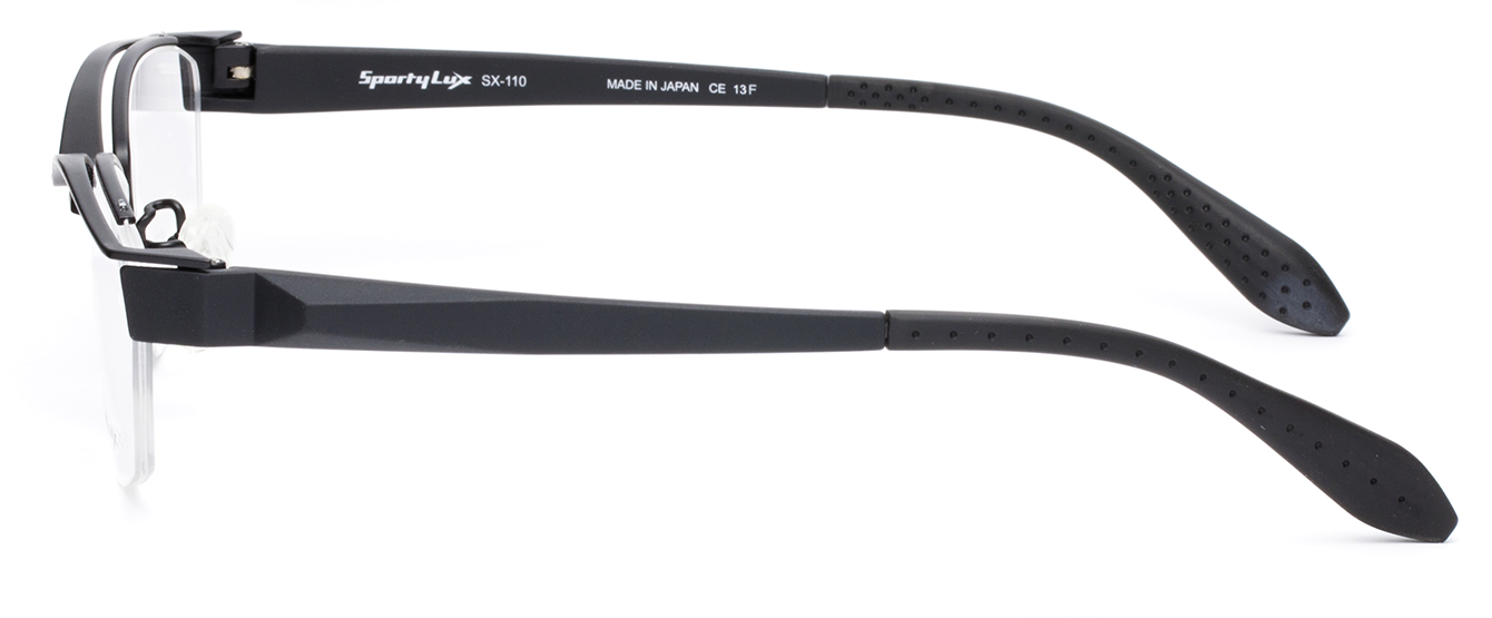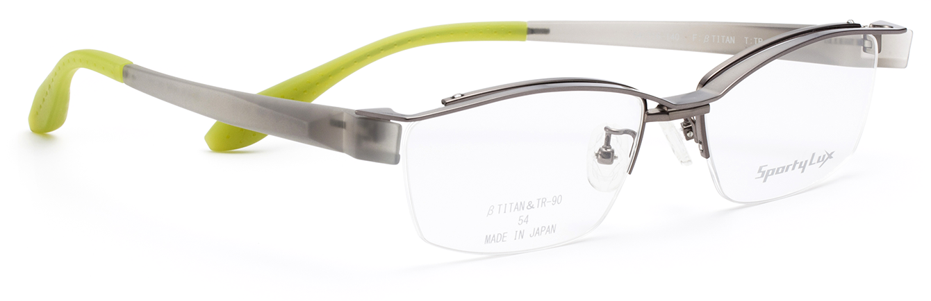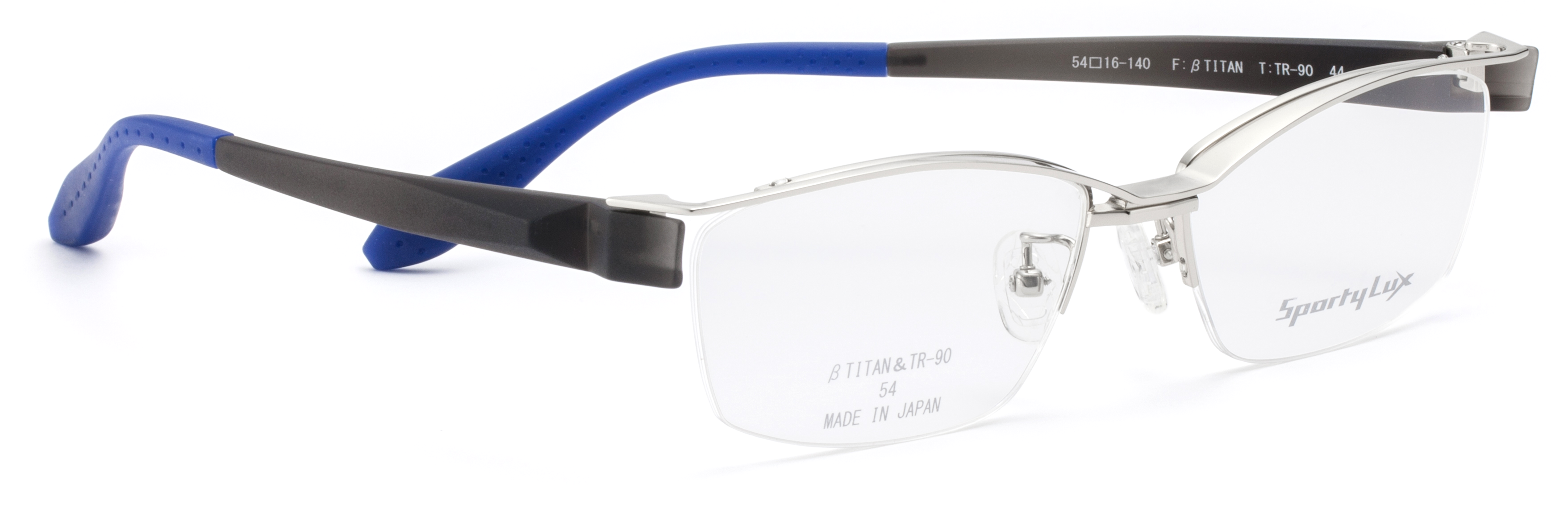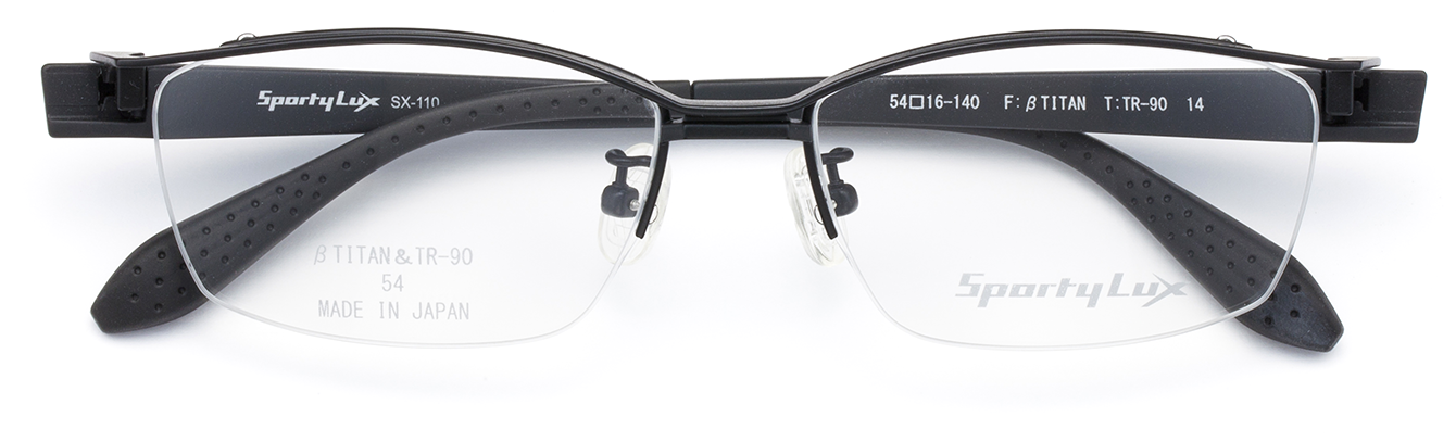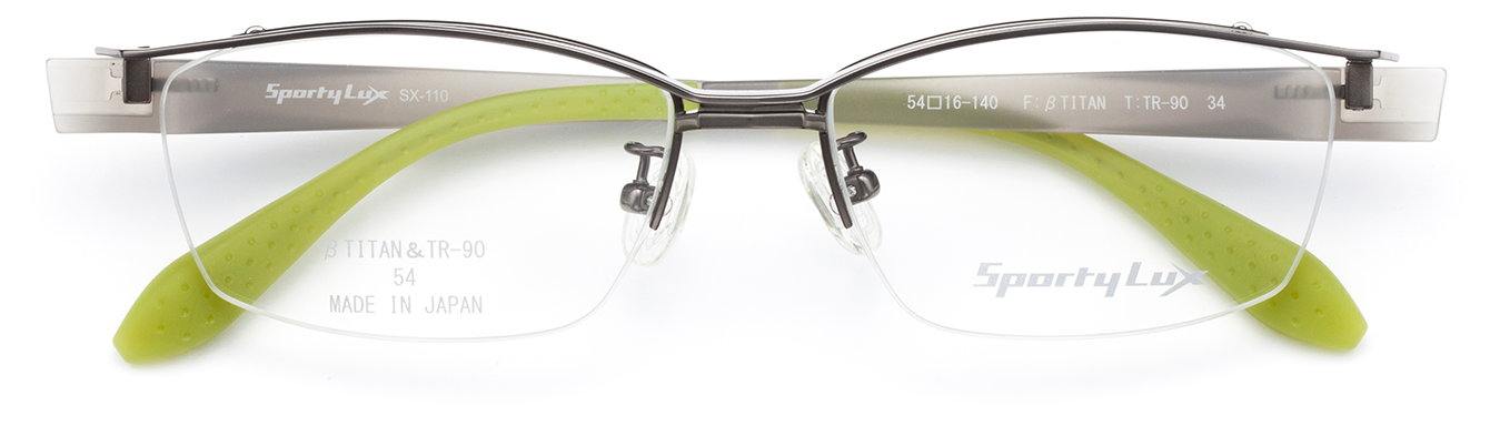フロントはβチタン、テンプルは軽量で弾力性のある超弾性樹脂を使用したモデルです。頭部を包み込むような形状でホールド力に優れたフレームです。鼻パッドは鼻との接地面に溝を設けたハイグリップシリコンパッドを使用し、ずれにくく通気性も優れています。モダンには滑りにくいラバー素材にディンプル加工を施し、より滑りにくい仕様になっています。