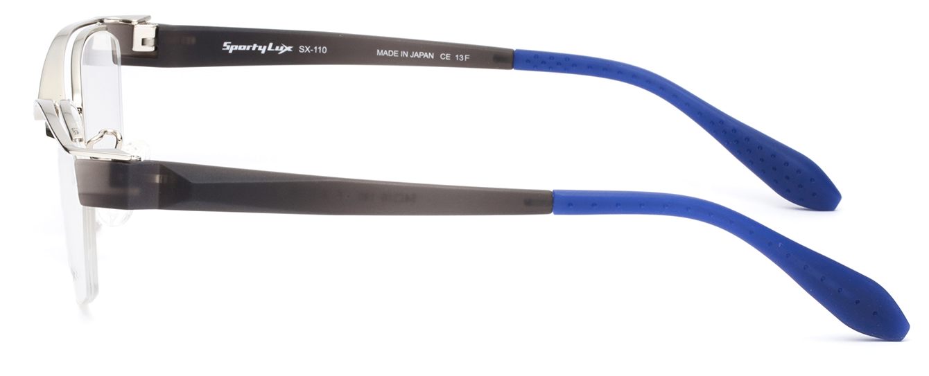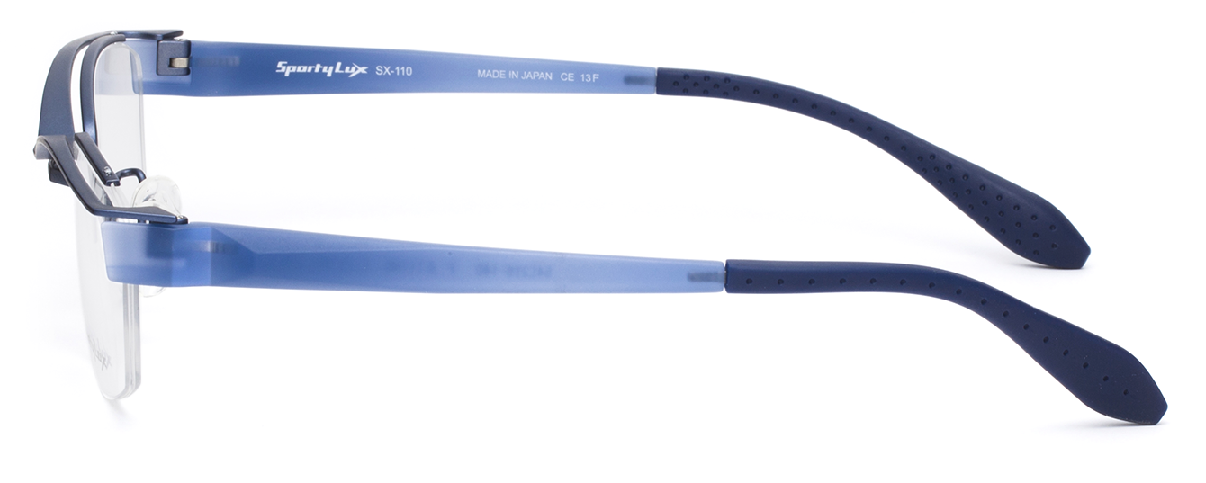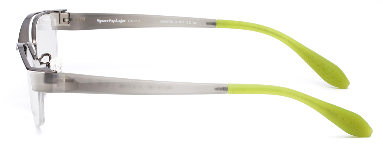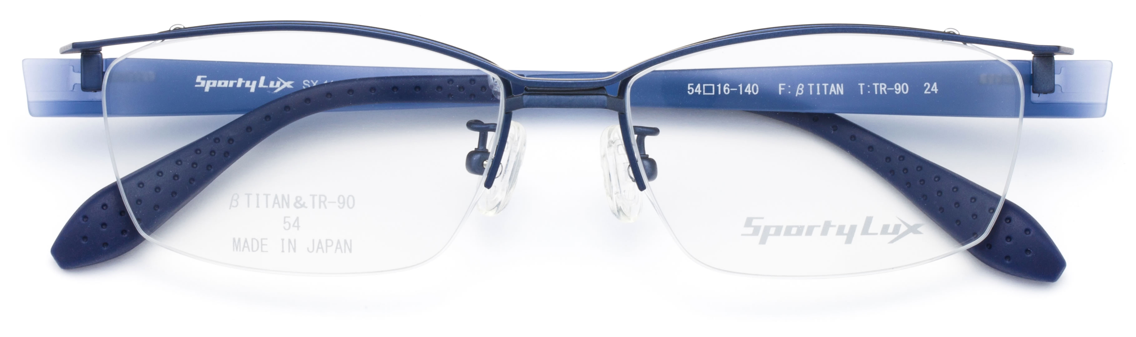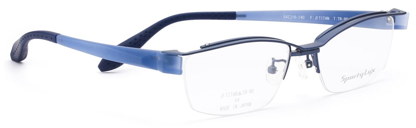 フロントはβチタン、テンプルは軽量で弾力性のある超弾性樹脂を使用したモデルです。頭部を包み込むような形状でホールド力に優れたフレームです。鼻パッドは鼻との接地面に溝を設けたハイグリップシリコンパッドを使用し、ずれにくく通気性も優れています。モダンには滑りにくいラバー素材にディンプル加工を施し、より滑りにくい仕様になっています。